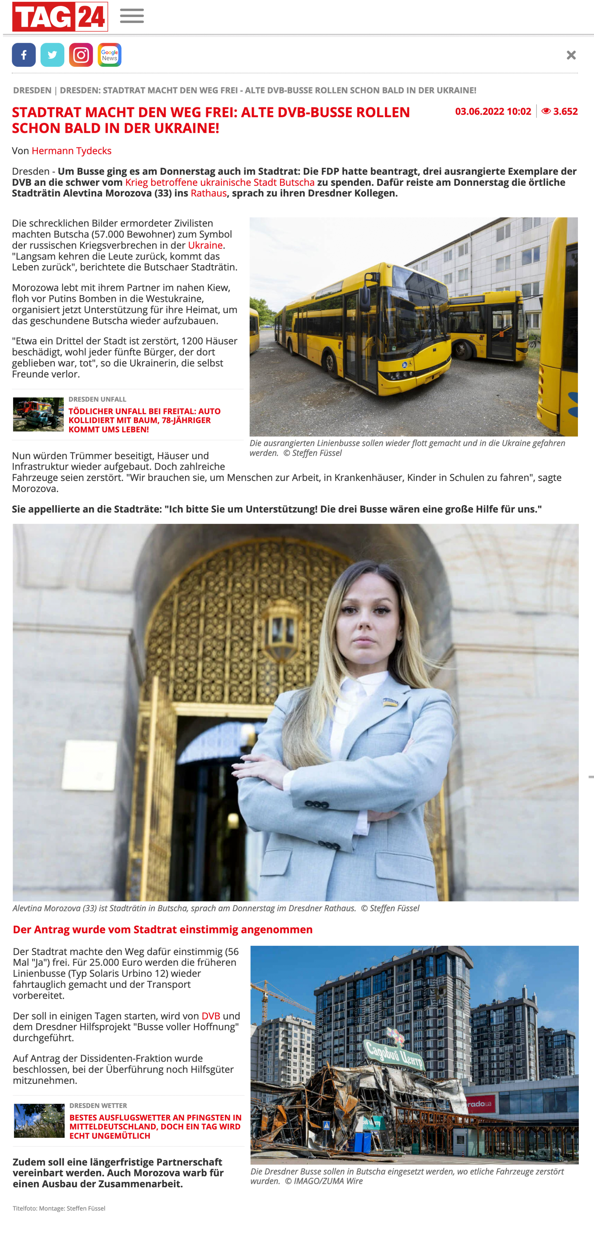 +++ Busse für Butscha: Der Stadtrat der Stadt Dresden berät am 02. Juni 2022 über eine Spende von drei Bussen der DVB Dresdner Verkehrsbetriebe für Butscha. Diese sollen nicht für Evakuierungen eingesetzt werden (wofür Stadtbusse auch nicht gemacht sind), sondern beim Wiederaufbau der Stadt helfen. Nachfolgend eine kurze Übersicht zum bisherigen Medienecho in Vorbereitung auf die Sitzung des Stadtrates. 👉